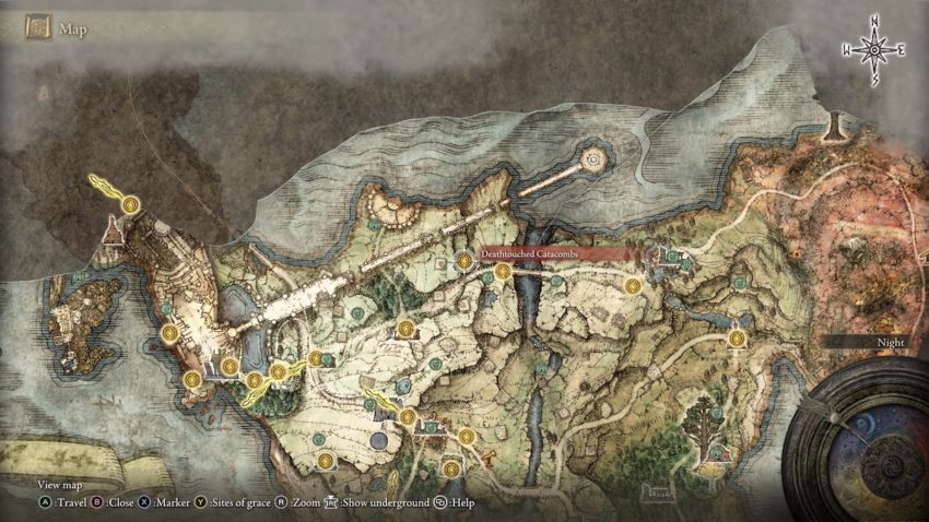 The Assassin’s Crimson Dagger Talisman is dropped by the boss enemy within the Deathtouched Catacombs. The catacombs are located just south of the northern coast of Limgrave. There is a stone staircase that takes you down into the Deathtouched Catacombs dungeon. The structure is that there is a boss door near the front of the dungeon, but you will need to fight through the dungeon to unlock it. This dungeon is filled with skeletons, wielding both swords and bows. The skeletons go down quickly but will revive if you don’t destroy their glowing ribcages on the ground.