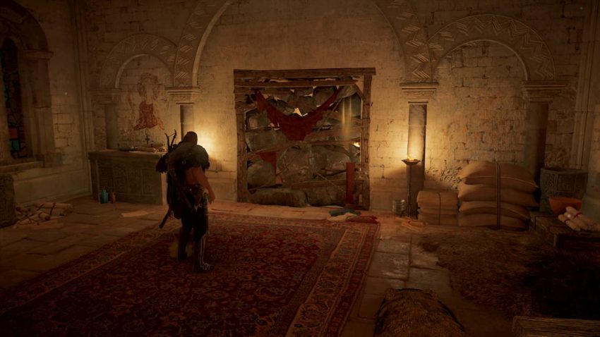 By taking out the glass window, you’ll be able to look inside and access the locks on the door. You’ll need to use your bow and arrow again, standing next to the door, to destroy the locks. Once the locks are destroyed, you can make your way inside the Abbey. But if you don’t act quick enough, an elite enemy will wander outside to greet you that you have to battle.