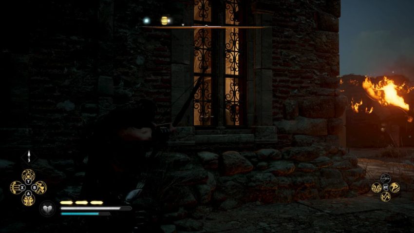 After you’ve cleared most of the town of its other pieces of cargo, the final one behind the Abbey will be the toughest to access. None of the doors can be opened from the outside. Many of the upper windows have been barricaded. You also won’t find any secret entrances to access the building from an underground passage. Instead, you want to pull out a bow and arrow to take out the glass windows, namely, the window next to the front door.