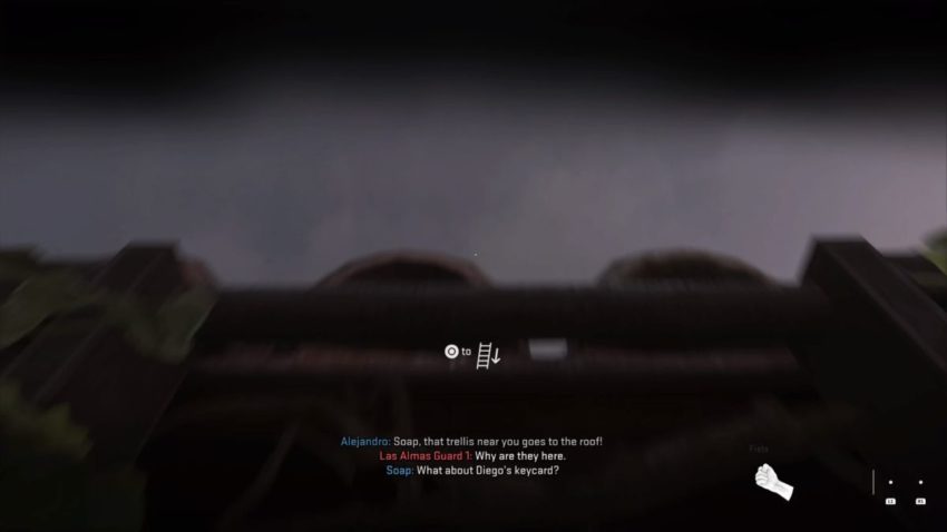 There are guards on the roof, but there are also plenty of bottles to distract them with. Throw the bottle to the east side, and sneak north on the west side. Go past the locked door and climb the ladder. Head to the top of the elevator shaft and take the ladder down, even though Ghost tells you to take it up (he also calls the elevator a “lift”, the crazy Brit).