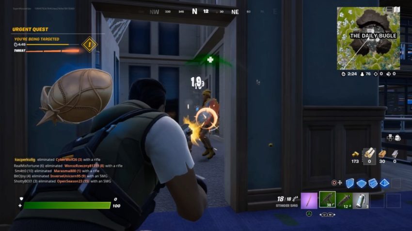 The highest concentration of webs is at the Daily Bugle, which is an office building in a crater in the northeast section of the map. The backpack is close to the entrance, but every player wants those Web-Shooters, so your chances of getting to the Daily Bugle backpack first are pretty slim. You’re better off sneaking around the building, listening for the telltale web-shooting sound, and eliminating whoever had the Web-Shooters so you can take them for yourself. You can’t miss them – they’re a very conspicuous pair of Spider-Man gloves.