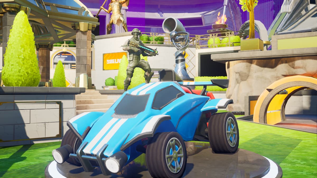 The crossover’s challenges can only be completed by playing the RL Live Deathmatch Creative map. Although it cannot be found in the main menu, you can head over to the Island Code tab and enter the following code to play it: 8205-6994-2065. You will then be sent to an arena to take on opponents in a two-team Rumble match where its challenges simply task you with dealing damage and earning eliminations. For instance, players who put 1,500 damage into enemies will unlock the Rocket League Trophy Back Bling. All of the rewards and their challenges can be discovered below.