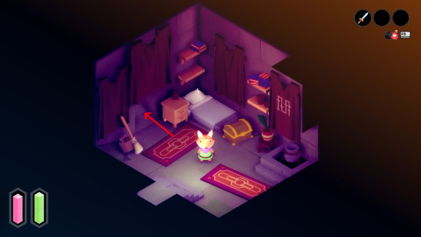 At first glance, the interior of the Old House is underwhelming. There’s a chest, but it holds a single coin, hardly a suitable reward for your hard work. But if you peek behind the curtain on the left, you’ll find your way through to a secret passage. Following the glowing pipe and you’ll come out in a cavern, with the shield lying in plain sight on the floor. As a bonus, flip the lever, and you’ll open the gate to progress further (along with a cheeky shortcut back to the central Overworld shrine).