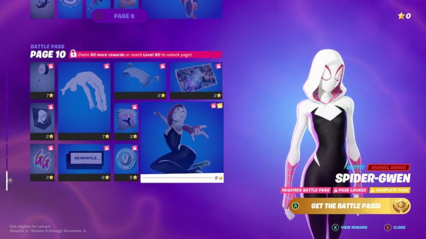 The Marvel Series Spider-Gwen is a skin exclusive to the Chapter 3 Season 4 Battle Pass, costing nine Battle Stars on Page 10. Players will need to own every other item on the page before being able to purchase Spider-Gwen, ultimately making her the pass’s final reward. Though, you can expect to earn other Spidey-themed goods while you work your way toward her. Page 10 even carries her own dedicated Banner Icon, Harvesting Tool, Emote, Loading Screen, and Glider.