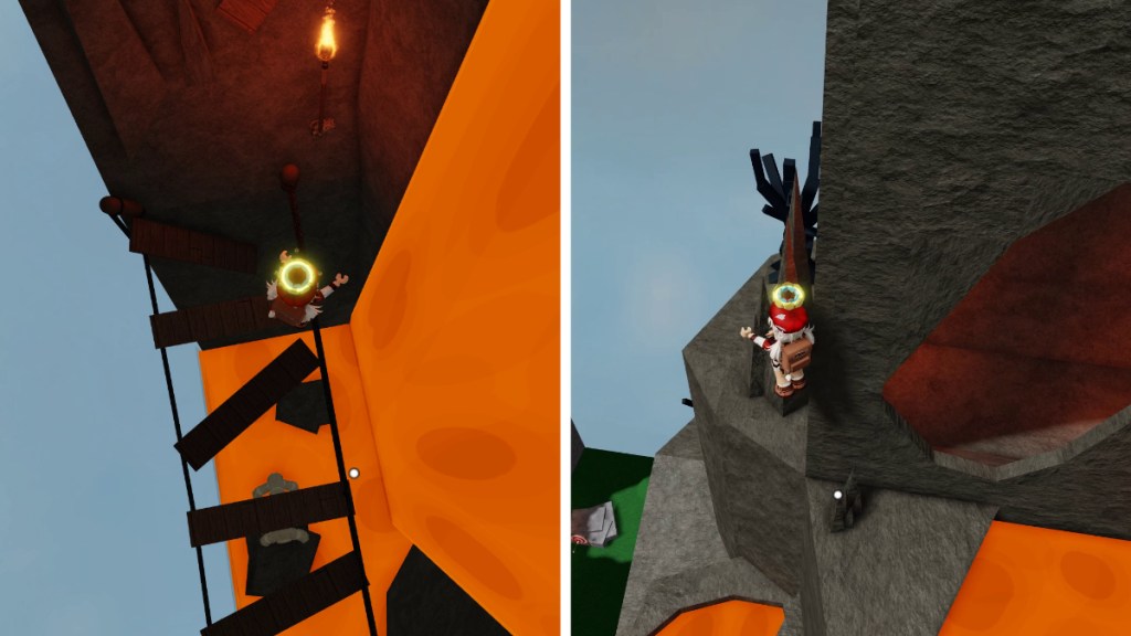 The seventh and final Orb for unlocking the Foliage Dungeon is behind the cave entrance of the Dragon Cliff. Follow the ascending slope up the mountain until you reach a rickety bridge with missing planks. The shadow cast by the cliff will make it hard to see where to jump, so aim your Roblox camera downward for more precise jumps. Climb to the upper level and go around the winding path to the cave entryway.