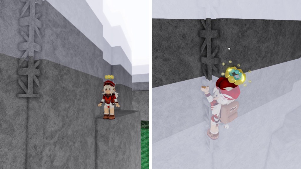 Finally, you will arrive at a large blue gateway next to a spiraling blue tree. Use the tree’s stairway-like leaves to climb to the top and jump onto the top of the gate. This next section is the hardest part of the journey, which might require numerous attempts before achieving success. You must step onto the stony ledge to the right of the gate’s inner area and leap across to reach a hidden ladder. After twenty-three tries of trial and error, we managed to grapple the ladder and ascended into a blue cube room, where we finally found the Sunlight Marker in Roblox Find the Markers.