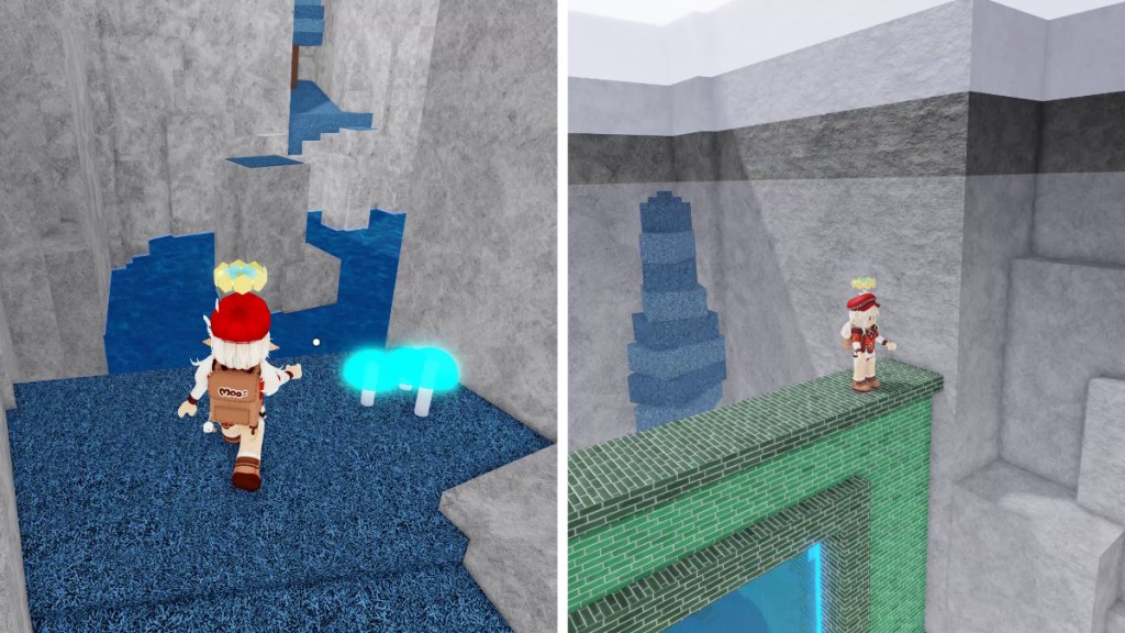 Return to Washable Kingdom’s Spawn and make your way to Fantasy Forest for the Foliage Dungeon’s third Orb. Use the jutting platforms on the cliff wall to ascend to the peak of the Roblox forest’s mountain waterfall. Go past the Waterfall Marker and drop onto the lower shelves on the right to find the Light Blue Orb.