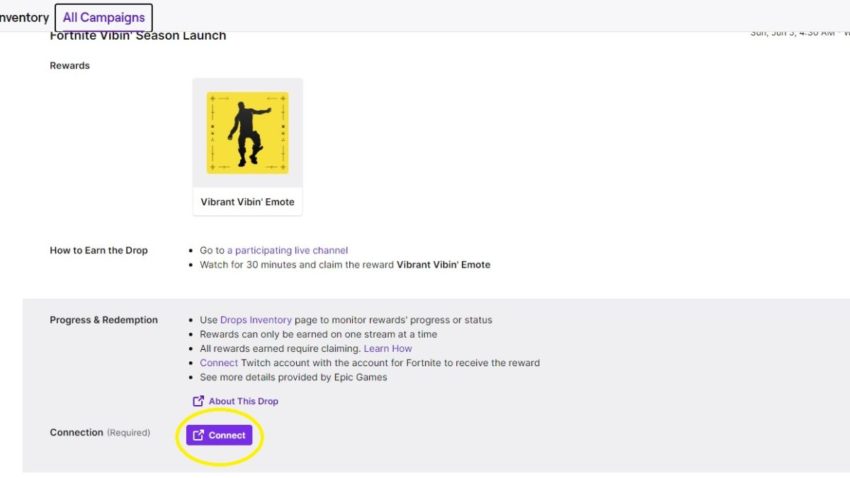 When you’ve arrived at the Drops menu, you should see Fortnite’s Vibrant Vibin’ dance first. Below the “Progress & Redemption” section, you should see “Connection (Required)” and a purple tab saying “Connect.” Click on the tab to get to the next menu.
