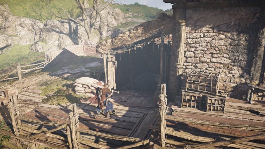 When you reach Bradeia, there are a handful of Frankish guards patrolling the location. You can eliminate them however you like by directly fighting them or taking them out one at a time using stealth. Once they’re gone, your next goal is to use Odin’s Sight to find the key hiding at the top of the farmhouse at the center of the area. When you reach it, there’s a small note on the table next to it describing how the father of the site hid his family’s wealth at the bottom of the shed, afraid that the attackers might find it. With the key, you can now find that location.