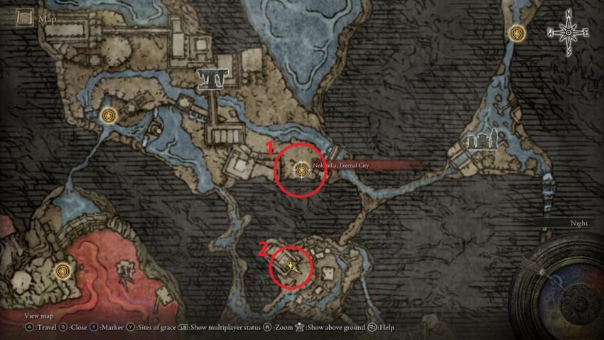 The nearest Site of Grace to the Wing of Astel is the Nokstella, Eternal City site, at the first location shown on the map above. To reach this Site of Grace, you’ll need to unlock the upper portion of the Ainsel River, which you can access through Renna’s Rise during Ranni’s questline. You can also use the Ainsel River Main Site of Grace, which you will unlock first, but we would recommend unlocking the Nokstella location regardless. The wing itself is at the second location shown on the map above.
