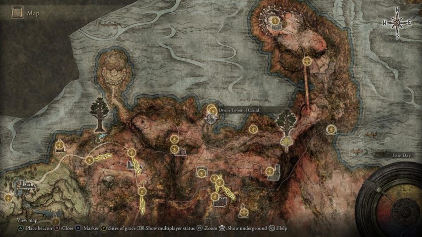 The Divine Tower is found in the northern section of Caelid; it’s located roughly halfway between the Dragonbarrow West and Dragonbarrow Fork Sites of Grace.