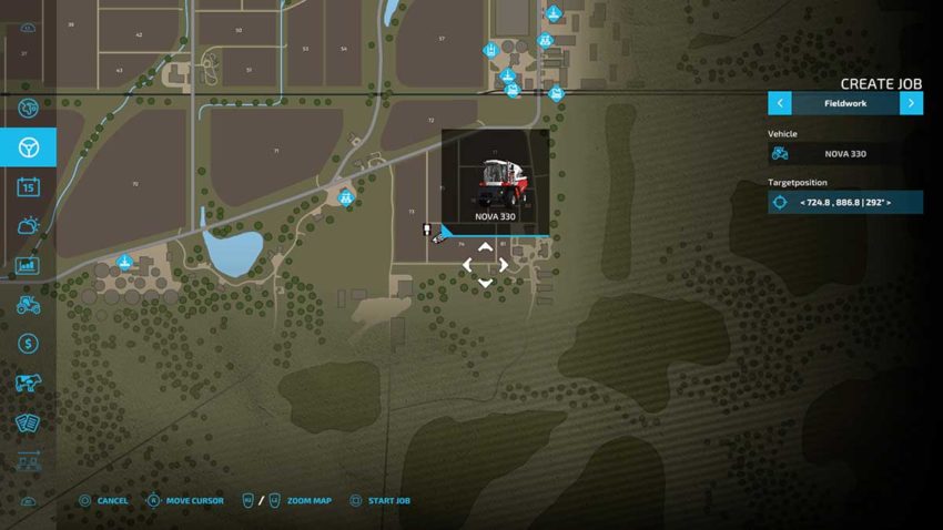 You can hire an AI worker from the cab of any vehicle, but it won’t do what you want it to unless you create a job. To do that, you need to open the menu and navigate to the work map. This is where you’ll be able to see your position and create a job for any work that needs doing. Pressing the Create Job button brings up some new UI on the right-hand side of the screen, which is where things get tricky.