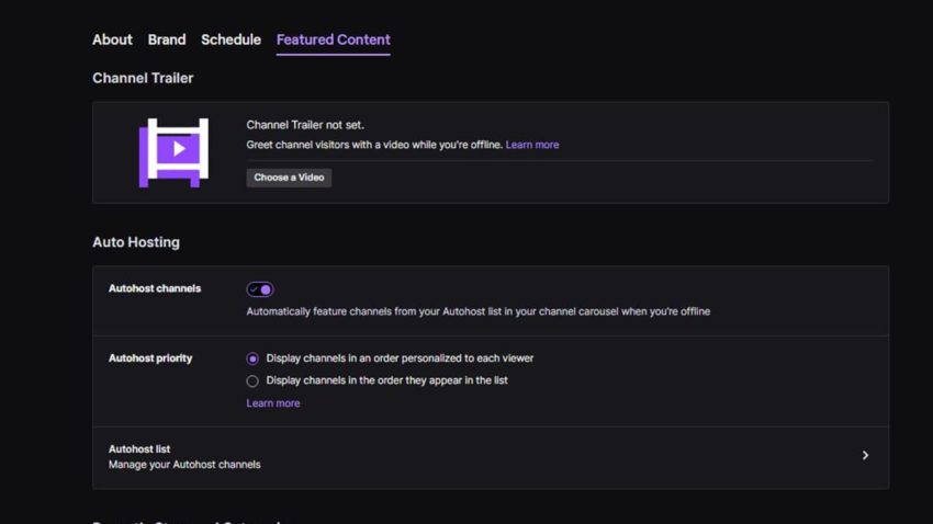 Alternatively, if you’re away from either your computer or phone, there’s the autohost list. Whenever you’re offline, your channel will automatically be a channel, as long as they are on the list. To add someone to your channel’s autohost list, go to your channel settings and then to featured content. You’ll then add the channels you want to autohost.