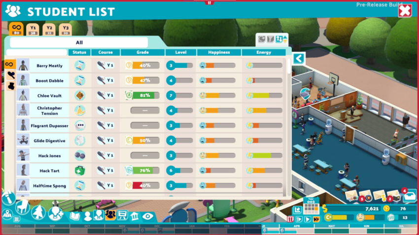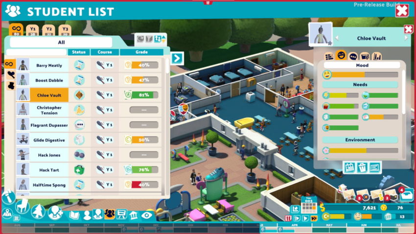 The best way to improve a student’s grades is to increase their mood, which means meeting all their needs. You can learn what needs they have by clicking on their name in the Student List. This will bring up a window on the right side of your screen, breaking down this information, along with their traits and what they’re feeling. For example, suppose a student lacks a particular need in any category. In that case, we recommend finding an item to add to your campus to improve it, such as adding food or drink vendors, a club for them to join, creating social events, or giving them access to showers, bathrooms, or more places to sleep.