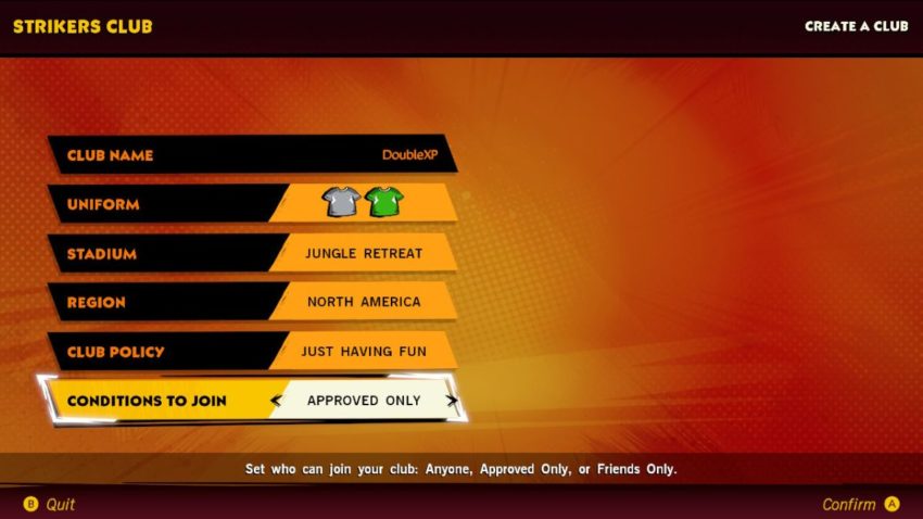 The club policy option allows you to state what type of people you are looking for. You can set certain policies like ‘all about winning’ to show that you want serious players, or you can choose ‘uses voice chat’ if you want teammates that you can talk to. You can even set a policy that requires your teammates to wear specific gear like the Turbo set. The conditions to join option allows you to choose whether you want the club to be open to the public or closed to only those you approve. You can even set it to friends only if you already have a dedicated group. Once all of these settings have been selected, press the A button to continue and create your group.