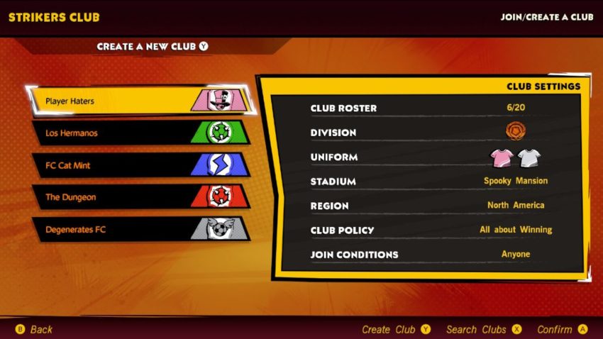 In the main menu, you will see a selection for the Strikers Club. Select that menu option and it will take you to a different menu where you can join or create a club. To start things off, you will need to select which character you want to use. Don’t worry, this can be changed later if you want to use a different character. Once your character is selected, press the Y button to start your journey into creating a club.