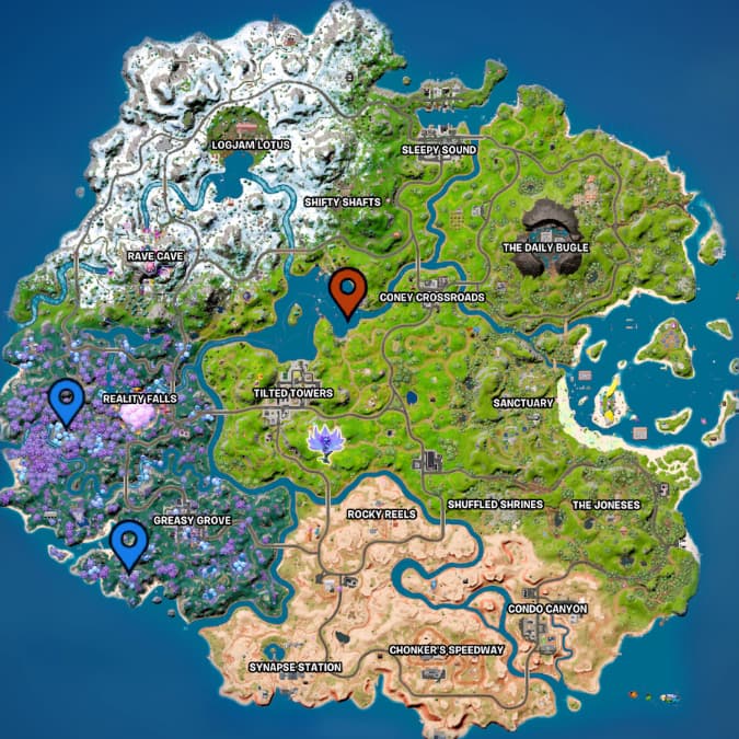 Groovy Grove and Fungi Farm are actually not far from one another. Groovy Grove is located west of Reality Falls and only consists of 12 tall mushrooms. Meanwhile, Fungi Farm can be found southwest of Greasy Grove and is home to three barns, a windmill, and plenty of loot. As marked in blue below, both of these landmarks are in the bottom-left corner of the map. After landing, you can then head to The Glow. This area is basically the right side of Loot Lake, just west of Coney Crossroads (marked in red below). The challenge can be completed once players do this in two separate matches.