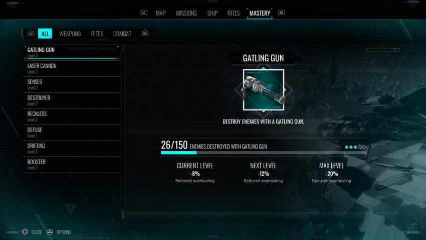 You can improve your weapons in multiple ways. The first has to do with your mastery of each equipment part of your ship. On the main menu, tab over to “Mastery” with the R1 button (or RB on Xbox). From there, you can check out your leveling statistics from each weapon you have. To level up your arsenal, you will need to complete specific tasks. For example, with the Gatling Gun, you simply have to destroy a certain amount of enemies with the weapon. Once you hit the maximum level, you’ll have 20% less overheating, making for more firepower and less waiting around.