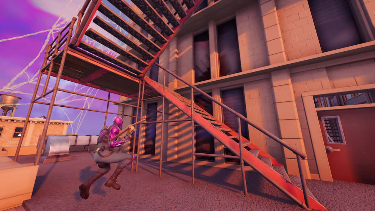 To begin this quest, you’ll want to make your way to the back of The Daily Bugle’s largest tower. As marked below, there is a set of stairs that lead to the tower’s roof — not to be confused with the stairs underneath it. You should then start by mantling from the metal railing on the side of the first staircase (as shown above). Directly after, you’ll need to quickly turn around and mantle onto the railing that leads to the next staircase. You will have to continue doing this at a fast pace on each railing that follows until you end up on the roof of the building.