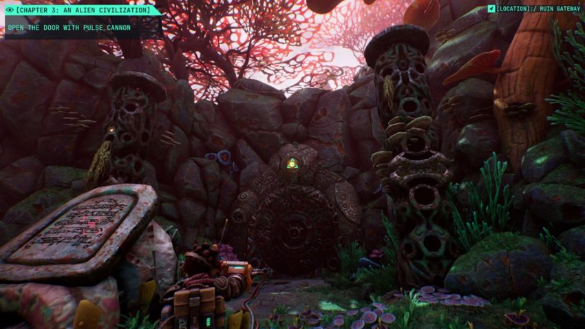 After you observe the ancient statue and meet the animal in person, you are faced with a metal door that blocks you from further exploration. You’ll need a new tool for your power glove to overcome it. Behind you is a path above the river. Use your platforming skills to jump over the rocks and mushroom, and then use the vine to climb to a higher section. Cross the bridge and on your left is a fast travel station. However, before you do that, make sure you scan the inscription on the statue. This will help you gain more upgrades.