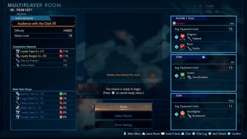 This screen will be home for the vast majority of the online co-op in Stranger of Paradise. From here you can see the names of you and your partners. you can also see which class and weapons they are using. From this screen, you can select which mission you want to embark on. On a special note, allies can’t embark on missions that they have yet to unlock. In this case, pick the latest mission your team needs to complete, and help advance the story together. From this screen, you can also invite a friend directly from the friends list.