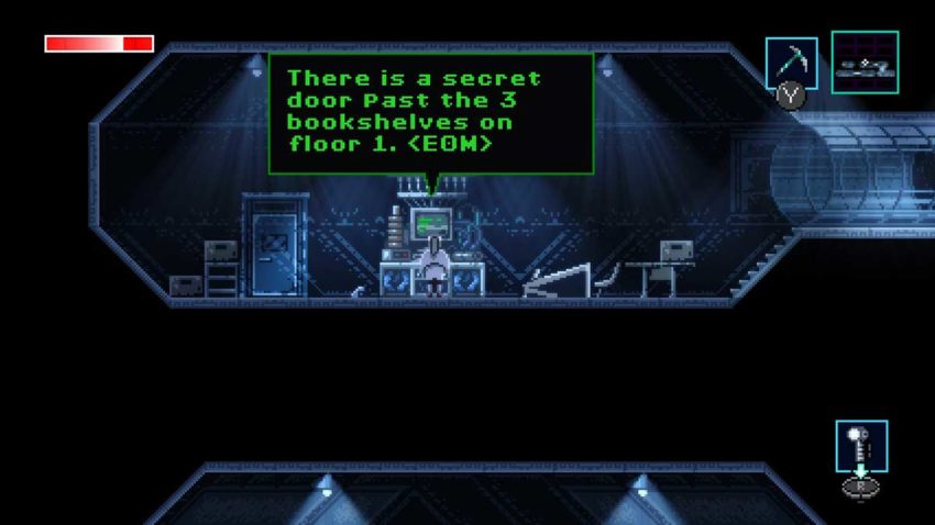On your way to the power switch, you may have noticed a powered-down computer in the previous pod. Returning there now will reveal a message that will only play once, so pay attention. It tells you that there’s a secret door on floor 1 next to the three bookcases.