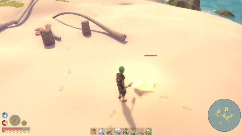 You may have noticed the yellow crystals scattered across the island. If you look closely, you will see that these crystals repel water. You will be taking advantage of that ability here in a moment. Before that, you need to build a Builder’s Bench. This will cost you eight seagrass and 10 tree branches. You can then build the workbench from your inventory screen.