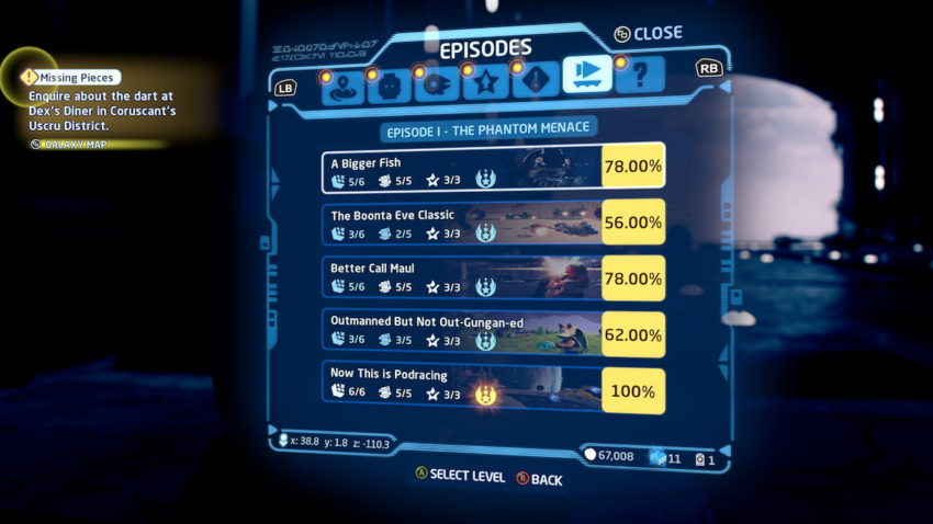 Some of the best ways to acquire studs are by playing through the larger missions available in the various Episodes. For example, in Episode I: The Phantom Menace, the A Bigger Fish and Now This is Podracing missions feature an on-the-rails experience. In each mission, you’ll be trying to shoot at specific targets throughout it, with each solid hit landing you a small number of studs. These studs stack up quickly, and you can walk around with 50,000 to 80,000 studs at the end of each mission. The Episodes in The Skywalker Saga have one or two of these missions, and repeating them has been the best way to get studs quickly.