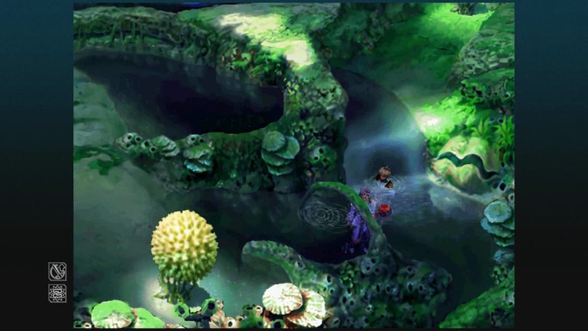 After the events in Viper Manor, you will find yourself in the water village of Guldove. Progress through the story until it is time to ride the boat (your Kid choice does not matter.) Head to the bar and talk to the Dwarf in the back — he will grant you the Green Tinkler. Take the boat back to Termina, back to the Hydra Marshes, and head back to the plant that slapped you. Use the Green Tinkler and you can proceed through the Marshes. Head through to the right until you cannot go right anymore and you should see the screen pictured above. In that cave is the Good Backbone.