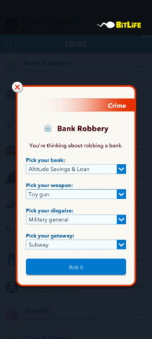 You can choose to commit a crime underneath the Activities tab. You’ll be able to do this anytime, so long as your character is above the age of 18. For example, in the crimes tab, you’ll have the option to rob a bank at the very top. When you choose to rob a bank, there are four unique options available to you: The bank you’ll rob, the weapon you’ll use, the disguise you’re going to wear, and your method of escape.