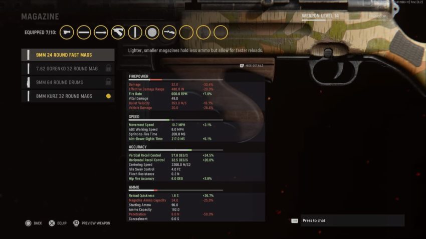 It’s best first to view this report when all of the attachments on your desired weapon are equipped. Next, while looking at your last applied attachment, press R2 or RT (depending on your platform). A chart will then appear on the screen (as shown below) detailing your current weapon’s statistics. In addition, as you hover over another attachment in a particular category, the chart will then detail the increases and decreases of these weapon attributes if chosen.