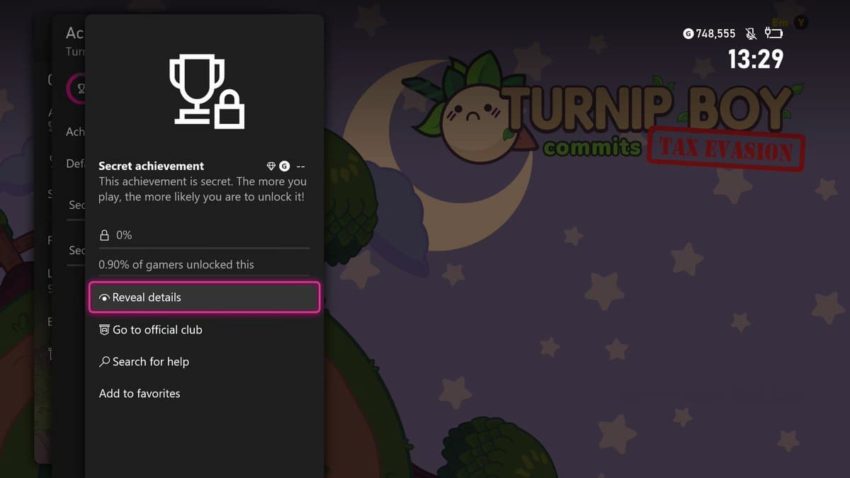 To view secret achievement details, all you need to do is pull up the achievement in question, and there will be a new option here called Reveal details. Click it, and the achievement description will be made visible to you until you decide to hide it again.
