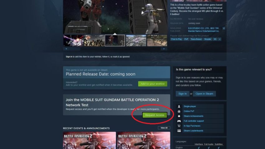 In order to sign up for the Mobile Suit Gundam Battle Operation 2 PC network test, go to the game’s Steam page.