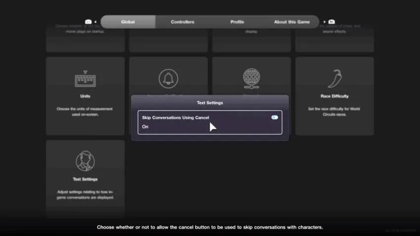 If you’re happy socializing with what appears to be a random selection of LinkedIn profile photos, then don’t let us stop you. But if you’d rather skip these mostly unnecessary tutorials, then there is a way. On the World Map screen, either click on the GT logo in the top-left corner, or press the Options button, then select Options from the GT Menu. Under the Global tab, go down to Text Settings and set “Skip Conversations Using Cancel” to On. Now, instead of repeatedly tapping X to hurry every tutorial chat to its conclusion, you can press Circle as soon as one of your little helpers tries to start a conversation, and they’ll immediately go away and leave you alone.