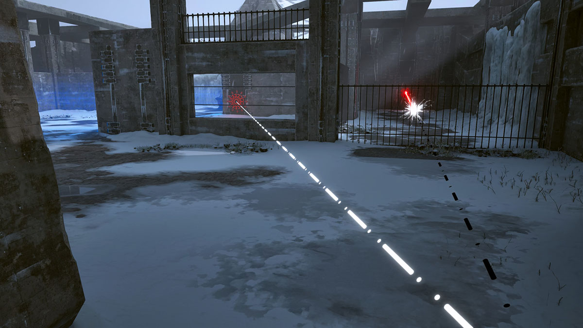 Now, you’ll want to use the Connector on all the Transmitters and Receivers in this puzzle room. There is a red Transmitter and blue Transmitter down the far end behind some bars. The blue and red Receivers are next to the Energy Gates – blue at the front and red at the back. This can be done in any order, but I Connected the blue Transmitter and Receiver, then walked over to the red Transmitter and Receivier and Connected them. So you should have four Connections at this point to the Connector.