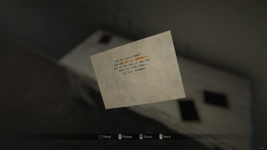 There is a note that you can find as soon as you enter the attic. This note is pictured in the image below and gives you the hint of adding and subtracting. This will be needed to complete the puzzle. On the back wall of the attic, interact with the hole to spot the number 43.