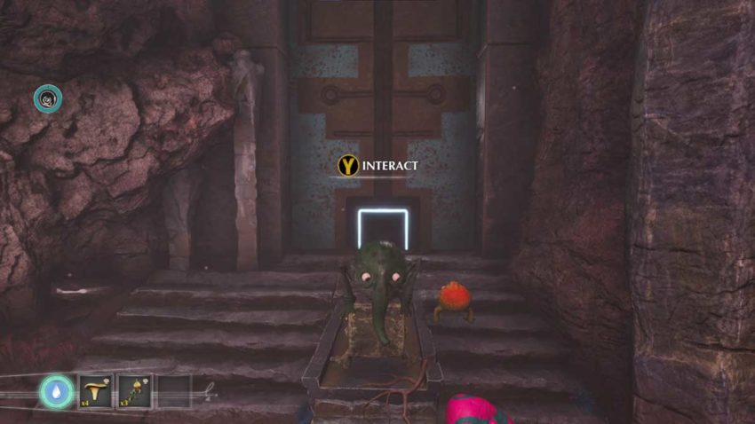 Once you’ve found and acquired your third Trebhum, you can jump on the platform outside of the Elder Temple door and open it. Follow the path inside and suck up all the knowledge that you can. It’s coating the walls and looks like a shiny lichen. Eventually, you’ll come to a glowing wall with a square underneath. You need to open this wall to progress.