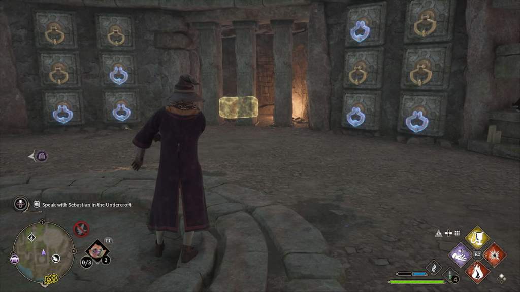 When you arrive, the entrance to the Treasure Vault will be locked. You will need to use Accio on the lever to the left of the door opening the entrance. Head down into the dungeon, and there will be an Inferius you have to battle against before you can start working on the Treasure Vault puzzle. These creatures are quickly dispatched using fire-based spells like Incendio or Confringo. After you’ve dispatched the enemy, like the entrance to the Treasure Vault, there will be multiple levers to the left and right of the treasure chest entrance.