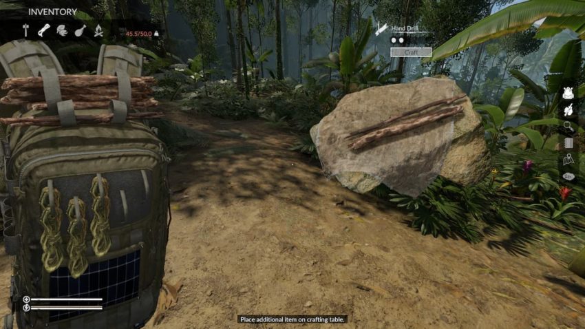 To light the fire, players need a Hand Drill. Hand Drills are built by combining a Small Stick and a Stick from your backpack. To craft, you’ll need to right-click and select “Craft.” Then, you can drag and add items as needed from there. Once you’ve crafted the Hand Drill, you must use a tinder item to start the necessary embers. Various things can be used, including a dry leaf, bird nest, or fiber. Right-click and select “Use”, your character will seat themself, and once you’ve placed your tinder item into the hand-drill, they’ll form an ember. Carry the ember they produce to your fire.