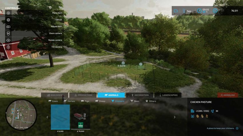 The first thing you need to do is buy a chicken enclosure. Open the main menu and navigate to the build option, the icon with three lines on it. From here, you can choose the Construction option and then move along to the Animals tab. Finally, select Chickens, and you’ll be presented with two enclosures that you can build. One can hold 30 chickens, and the other can hold 160. Select your enclosure and place it on your farm. You can only place the enclosure on land you own.