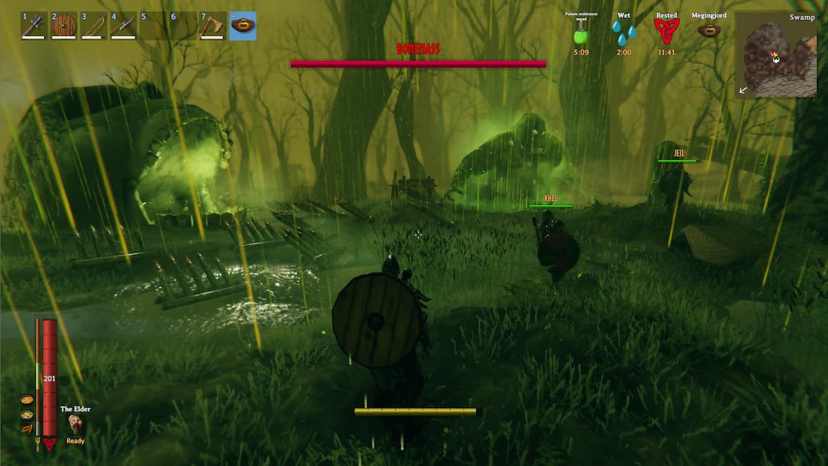 You and your party members primarily want to stay away from the front of Bonemass during the fight. It has three attacks that it uses during the engagement. The first and most annoying of them is where it upchucks a massive poison cloud in front of it, spewing it all over the ground. You’ll notice it’s about to unleash it as it pulls its head back and then releases onto any target in front of it. The attack does damage over time, and it can truly make or break a team or engages Bonemass too quickly. Make sure to have your poison resistance mead active at all times. The mead lasts for 10 minutes. It does not prevent you from taking poison damage, but it lowers the damage over time tick by at least half.