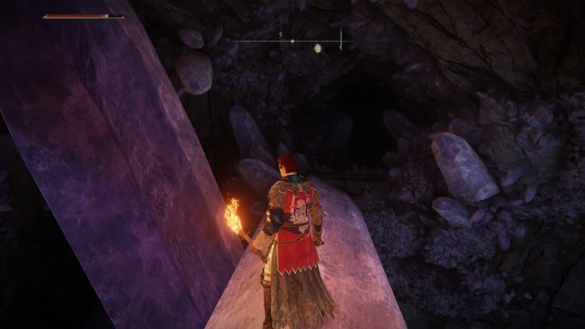 Progress through the cave, continuing forward. Hit the wall again to reveal another illusion door if you’re blocked. Your goal is to progress through the Hideaway until you reach the large cavern outside the boss’ door. When you’re at the boss’s door, look for the statue of Marika. At the entrance to that room, go to the left and jump up the purple crystals. You’ll find an entrance on the side of a wall you can use.