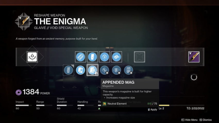 You’ll be able to do this with any crafted weapons you’ve already created from the Enclave. You’ll only be able to do this after progressing through The Witch Queen expansion, where you create your first weapon, The Enigma. From there, any weapons you craft and make at the Enclave can be remade if you want to modify these changes.