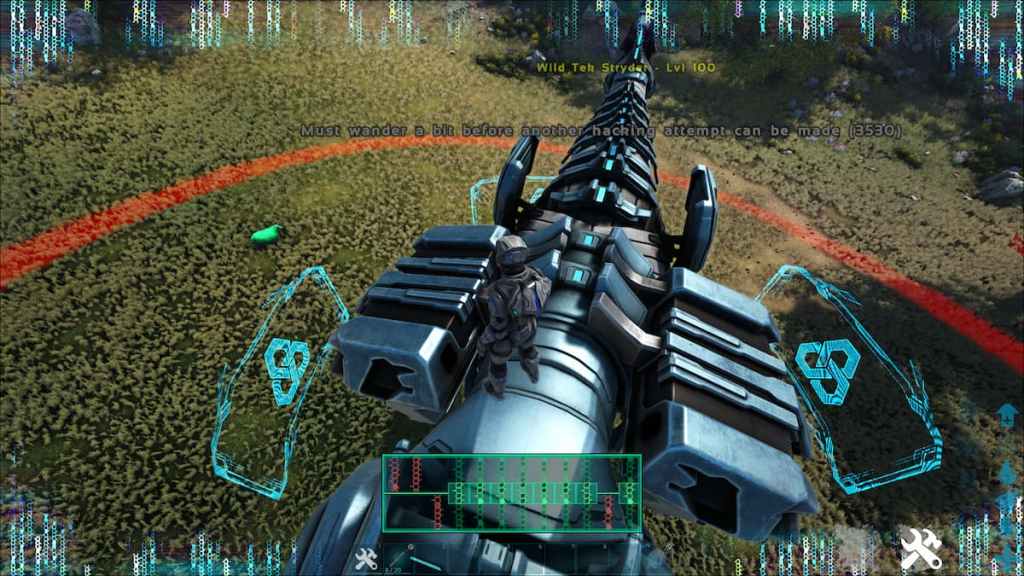 To start Hacking, you need to place the Mutagel in the last slot of your Hotbar and land on its back to begin the Hacking process with your interact key. This will create a ring around the Tek Stryder to indicate the radius you can remain in to keep hacking. The text above the Tek Stryder’s back will tell you where you need to interact.