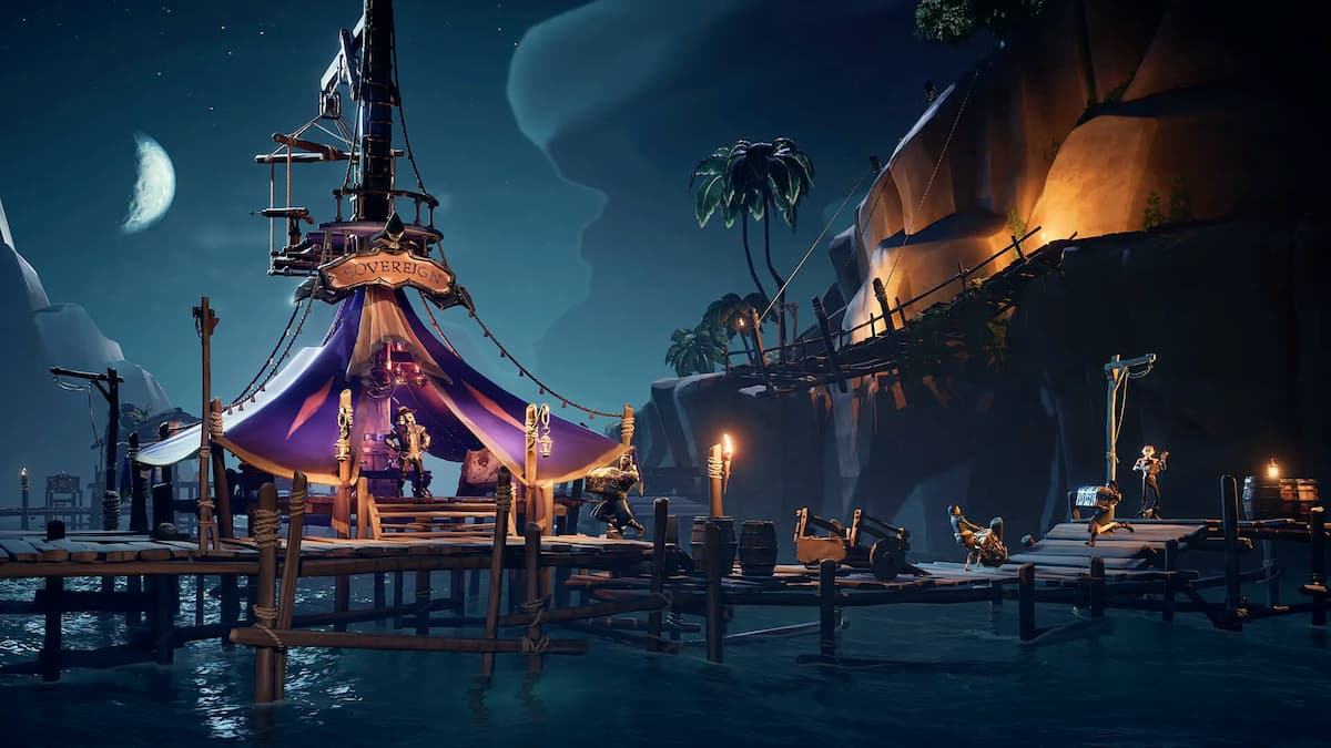There is a separate dock for the Sovereigns at each of the seven Outposts in Sea of Thieves, distant from where your ship spawns. You may have noticed that these docks were before Season 7, but now they are decored with a fancy purple tent — you can’t miss it. For reference, here is approximately where each Sovereign tent is at each Outpost, using the Tavern as a starting point: