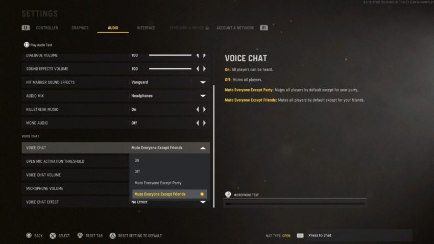 Activision and Sledgehammer Games have provied many options for you to consider when it comes to voicechat. On the main menu, press Options, Start, or whatever key you have the pause button setton to. You’ll then be greeted by the Settings menu. Now, toggle your way to the Audio section. Under the slew of game sound options, you’ll find the Voice Chat column. You’ll see a drop down menu on “Voice Chat.” Select it and these selections will be shown on screen.