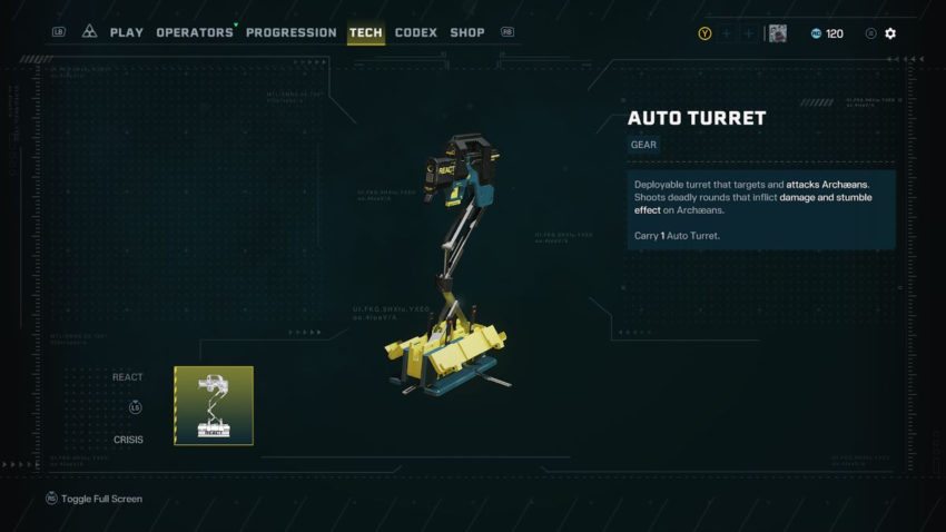 You can only carry one at a time, with the Turret loaded with 60 rounds that will be directed at any moving target, with the added bonus of a stumbling effect on any Archaean it doesn’t kill to slow them down. It has less than a 90-degree rotation, though, so line it up wisely. Once it’s drained or destroyed by an enemy, you can equip a new one via any React supply stash you come across, meaning it’s possible to deploy one Auto Turret, resupply, and then deploy the second one in the same area, but some restrictions can apply to the number of gadgets placed at any one time.