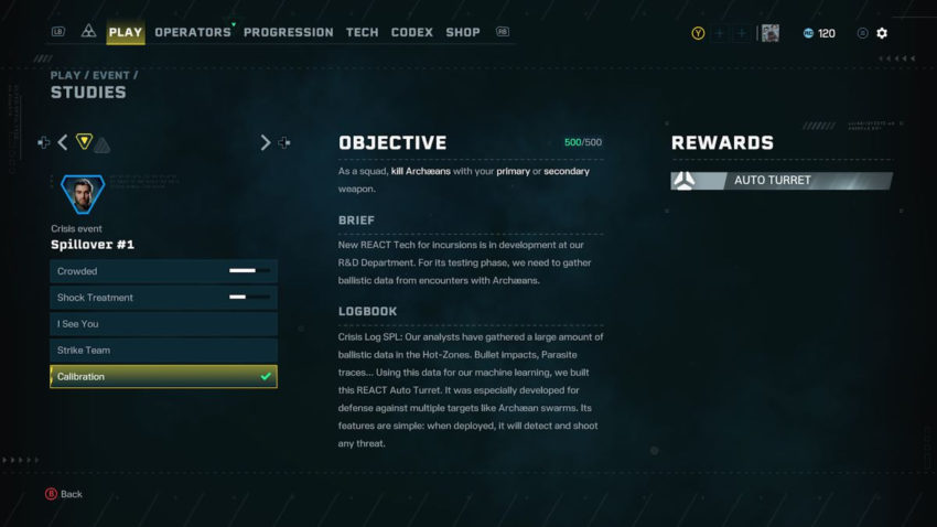 Although available across all modes, you will need to give Spillover at least one try to get things moving. This is because the Auto Turret is a reward for completing one of the Studies mini-objectives that appear once you access the new event. The task is for you, as a squad, to get 500 kills using primary or secondary weapons ― so basically anything that isn’t an explosive or ability kill by anyone on your team.