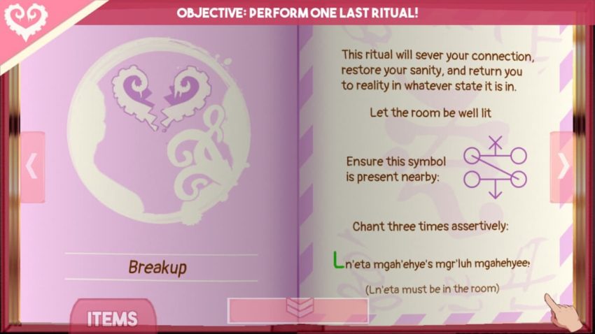 To end your insanity and return back to your reality, you’ll have to take matters into your own hands and end things with Ln’eta. To do this, first, perform the Dark Communion ritual. Then, once you turn off all the lights and Ln’eta falls asleep, turn back to the page in her book that gives instructions on the ritual Breakup.