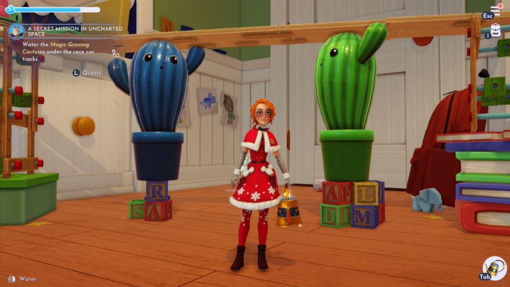 The Magic Growing Cactuses are scattered about the room as well with some people near books and others inside the closet. After getting them all, place them under the pieces of track that need elevated. These track pieces will be sparkling making them hard to miss. Once they are placed, water the cacti to make them grow. Speak to Buzz and he will want you to place the car on the track at the top of the ladder. After doing this, you will get a short cutscene showing the car going around the track before hitting the window and unlocking it. Woody is saved!